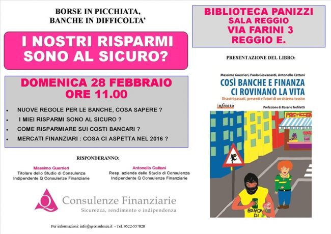 Domenica 28 febbraio ore 11.00 . Sala Reggio – Biblioteca Panizzi Cosa bisogna sapere quando si va in banca? Presentazione del libro “Cosi’ banche e finanza ci rovinano la vita”…