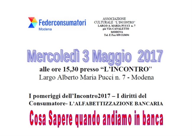 In collaborazione con Federconsumatori Modena, si terranno due incontri di educazione finanziaria presso l’associazione culturale “L’Incontro” in largo Pucci a Modena. Nel primo, in programma mercoledì 3 maggio alle ore…