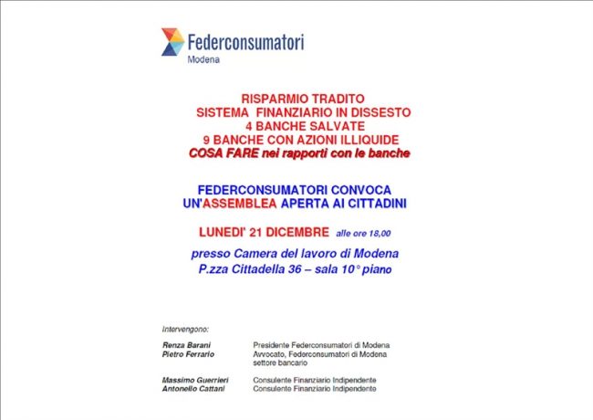 Lunedì 21 dicembre alle ore 18.00 a Modena, presso la Camera del Lavoro CGIL si terrà una pubblica assemblea dove si farà il punto sull’attuale situazione delle banche italiane alla…