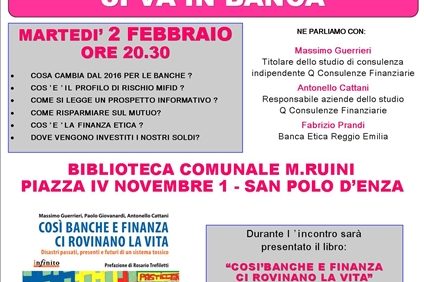 Martedì 2 febbraio alle ore 20.30 – presso la Biblioteca Comunale del Comune di San Polo d’Enza si terrà l’incontro dal titolo “Cosa sapere quando si va in banca”, promosso dall’Amministrazione Comunale in collaborazione con lo…