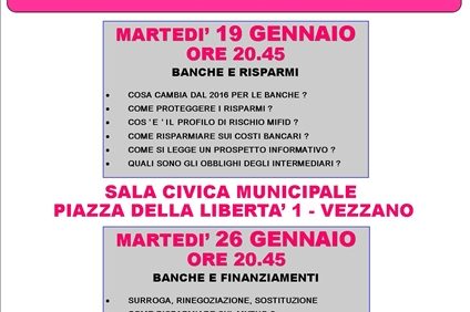 Martedì 19 gennaio alle ore 20.45 – presso la Sala Civica del Comune di Vezzano sul Crostolo (Piazza della Libertà) – prende il via il ciclo d’incontri rivolto alla cittadinanza “Cosa sapere quando si va in banca”, promosso…